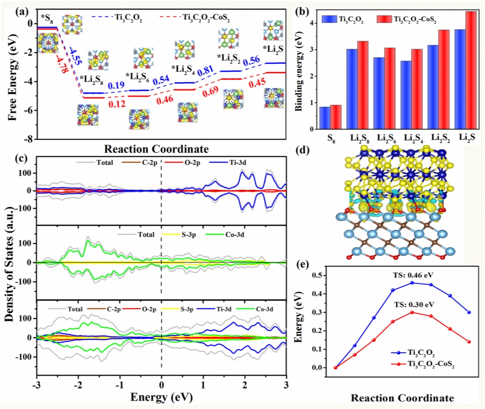 圖4aTi3C2O2-CoS2和Ti3C2O2上的LiPSs的吉布斯自由能圖。bLiPSs與Ti3C2O2-CoS2和Ti3C2O2層之間的結合能。c計算出CoS2、Ti3C2O2和Ti3C2O2-CoS2的態密度。dTi3C2O2-CoS2的差分電荷密度。eLi2S在Ti3C2O2-CoS2和Ti3C2O2上分解的能量分布。@TheAuthors