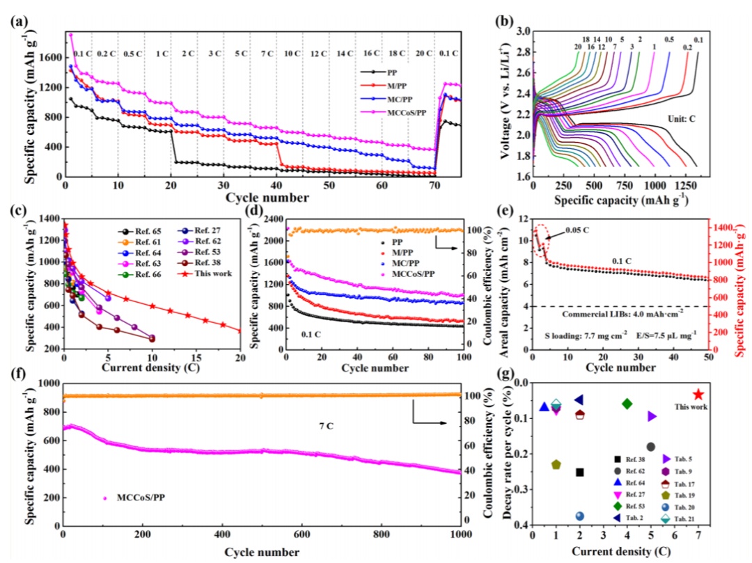 圖5電化學性能。a評價不同隔膜的性能。b基于MCCoS/PP的鋰硫電池在不同電流密度下的恒流充放電曲線。cMCCoS/PP作為鋰硫電池隔膜與其他MX基材料的倍率性能比較。d基于不同隔膜的鋰硫電池在0.1C下的循環性能;e基于MCCoS/PP隔膜的鋰硫電池在高硫負載和低電解質/硫比下的循環性能。f基于MCCoS/PP隔膜的鋰硫電池在7C下的長循環性能。gMCCoS/PP作為鋰硫電池隔膜與其他材料長循環性能的比較。@TheAuthors