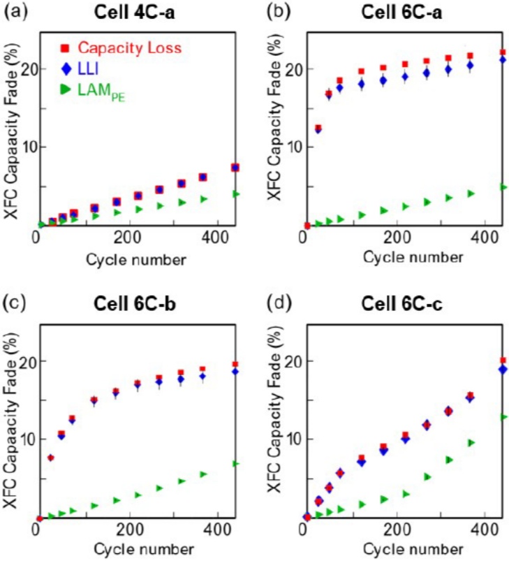 圖1.(a)電池4C-a,(b)電池6C-a,(c)電池6C-b,(d)電池6C-c的極端快速充電(XFC)循環期間的容量損失與循環數的函數重疊,以及從dQ/dV分析得到的總LLI和LAMPE。