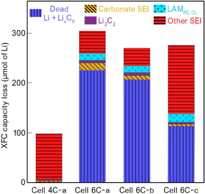 圖2.死鋰和死LixC6的形成(通過MST測量),固體碳酸鹽SEI沉積(通過MST測量),Li2C2的形成(通過MST測量),正極活性材料的損失(LAMPE,CL,通過dQ/dV測量),以及其他SEI沉積,對四個測試電池在450次XFC循環后的XFC容量損失的貢獻。