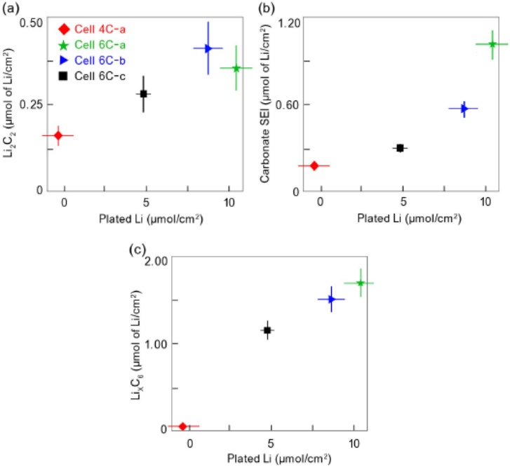 在圖3(a)中,作者發現Li2C2SEI物種的數量與四個電池中的析鋰層的數量呈正相關。在電池4C-a中觀察到的Li2C2可能是通過與鋰化石墨表面接觸的固體碳酸鹽物種的減少而形成的,因為在這個電池中沒有測量到析鋰。因此,在6C-a、6C-b和6C-c電池中觀察到的高于4C-a電池數量的Li2C2的增加主要歸因于析鋰沉積物的外表面與其他SEI成分的反應。這意味著死鋰與陽極上的其他SEI物種交織在一起,這樣,鋰和其他SEI物種可能是緊密接觸的。因此,作者推測隨著更多的死鋰沉積,死鋰和固體碳酸鹽SEI物種之間的接觸面積增加,導致固體碳酸鹽更多的轉化為Li2C2。