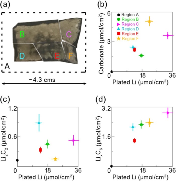 圖4.電池6C-a中衰減機制的局部變化。(a)被切成六個區域的電極圖像;電鍍Li的數量和(b)碳酸鹽SEI;(c)Li2C2;和(d)在XFC循環過程中形成的每單位面積的陽極的死LixC6之間的相關性。