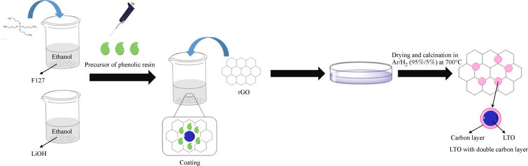 在這個溶膠凝膠法的合成過程中,先將液態的酚醛樹脂材料均勻地分散在鈦酸鋰的前驅體中,實現初步的碳包覆結構構造。隨后,在分散體系中進一步加入石墨烯。石墨烯上的含氧官能團能夠幫助石墨烯與酚醛樹脂包覆的鈦酸鋰前驅體的自組裝過程。最后,將分散體系烘干并高溫焙燒得到擁有多級碳包覆結構的鈦酸鋰復合材料(LTO/C/rGO)。