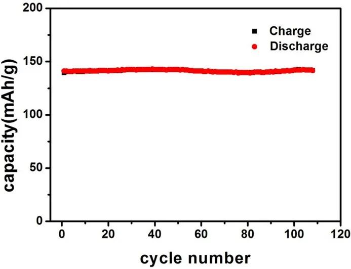 并且在碳結構的幫助下,材料的電導率顯著提高,優化了鈦酸鋰因低電導率帶來的高極化等問題。在30C充放電條件下,未包覆的鈦酸鋰材料、僅用酚醛樹脂形成碳包覆的材料、多級結構的LTO/C/rGO材料在30C快速充放電條件下的比容量分別為90mAh/g,110mAh/g和119mAh/g(圖2)。并且,在10C條件下,LTO/C/rGO材料在百圈循環甚至沒有發現容量衰減(圖3)。
