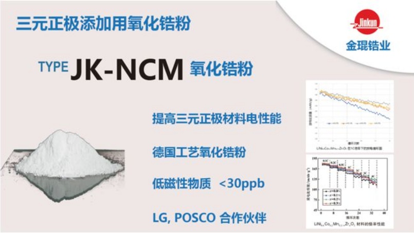 自2018開始,金琨西立長期為LG化學、POSCO等海外龍頭供給用于三元材料的氧化鋯粉。公司采用先進的德國工藝生產納米氧化鋯粉,并通過嚴格的工藝控制和德國SiLi公司的技術支持,確保粉體的高品質。公司自主研發的JK-NCM氧化鋯粉,具有一次粒徑小、粒度分布集中、磁性異物少等特點。JK-NCM氧化鋯粉大量用作三元正極材料添加劑,提升三元電池材料的電性能和循環表現。產品主要出口韓國和用于國內一線的三元材料廠家。同時公司也生產用于固態電解質的氧化鋯粉JK-Sol。