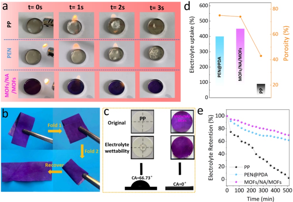 (a)浸潤(rùn)電解液的隔膜的燃燒試驗(yàn);(b)柔韌的MOFs/NA/MOFs隔膜;(c)商業(yè)PP隔膜和MOFs/NA/MOFs隔膜的液體電解質(zhì)潤(rùn)濕性對(duì)比;(d)電解質(zhì)吸收率;(e)電解液保持率