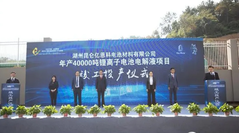 昆侖材料董事長郭營軍在投產儀式上表示,年產4萬噸鋰離子電池電解液項目于2021年8月啟動建設,并于今年7月進行了試生產,隨著該項目的投產,湖州昆侖電解液總產能達到6萬噸/年。