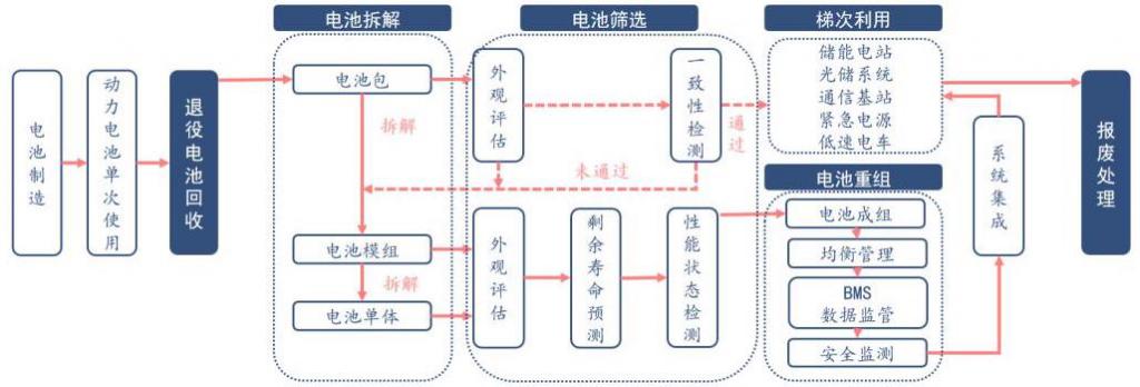 車用動力電池梯次利用工藝流程包括電池拆解、電池篩選、電池重組、系統集成等。退役電池包經過外觀評估以及一致性檢測則可以直接以整體形式用于低性能要求的場景;若未通過則需要將電池包拆解為電池模組或電池單體,并再次進行電池篩選。