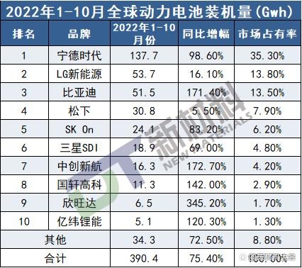 2022 年1-10 月,在全球動力電池裝機量前十名企業中,中國企業有6 家,占比超過50%;韓國企業3 家,日本企業1 家;歐洲和美國占較少的份額,約為2%。