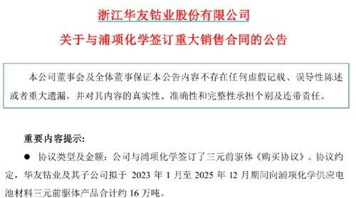 華友鈷業(yè)公告顯示,該公司與浦項(xiàng)化學(xué)簽訂了三元前驅(qū)體《購買協(xié)議》,華友鈷業(yè)及其子公司擬于2023年1月至2025年12 月期間向浦項(xiàng)化學(xué)供應(yīng)電池材料三元前驅(qū)體產(chǎn)品合計(jì)約16萬噸。