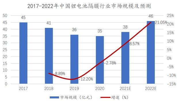 根據(jù)華經(jīng)產(chǎn)業(yè)研究院數(shù)據(jù)顯示,2017-2020 年中國(guó)鋰電池隔膜行業(yè)市場(chǎng)規(guī)模呈現(xiàn)下降趨勢(shì),到 2020 年中國(guó)鋰電池隔膜行業(yè)市場(chǎng)規(guī)模下降至 35 億元。其中2019 年市場(chǎng)規(guī)模下降的主要原因是鋰電隔膜國(guó)產(chǎn)化比例大幅提升,加之企業(yè)產(chǎn)能規(guī)模化效應(yīng)提升,導(dǎo)致隔膜成本進(jìn)一步下降,價(jià)格下降,2020 年是由于受到新冠疫情的影響。隨著新冠疫情得到控制以及隔膜出貨量的上升,未來(lái)我國(guó)鋰電池隔膜行業(yè)市場(chǎng)規(guī)模將逐漸回升,預(yù)計(jì)到 2022 年將達(dá)到 46 億元的水平。