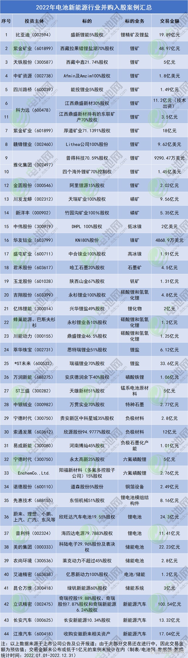 其實,在2022年,電池新能源領域并購、入股相關案例遠不止上表所列,部分交易金額未公布或低于1億元,或者存在較大不確定性的案例未統(tǒng)計在內,例如上汽集團領投青山實業(yè)旗下瑞浦能源的產業(yè)輪融資;*ST銀億擬不超4億元參與知豆汽車重整;振華股份3120萬元收購首能科技51%股權,進軍電解液領域;科陸電子擬掛牌轉讓車電網(wǎng)27%股權,引入戰(zhàn)略投資者;康隆達擬收購碳酸鋰生產商天成鋰業(yè)17.67%股權;贛鋒鋰業(yè)接盤碳酸鋰生產商天元鋰電100%股權…………