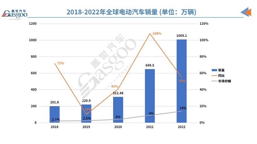 過去五年,全球電動汽車銷量取得了飛躍式的發展,從2018年的200萬輛上漲至2022年的逾1000萬輛,市場份額從2.5%漲至14%,電氣化的浪潮逐漸從單個市場輻射至全球。