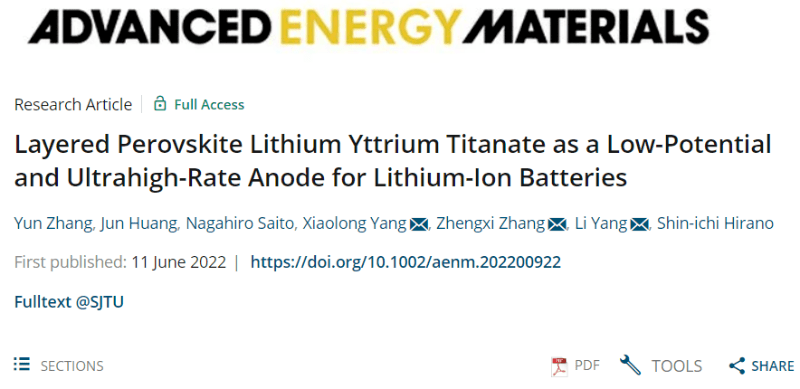 近日,上海交通大學(xué)化學(xué)化工學(xué)院楊立教授團(tuán)隊(duì)與重慶大學(xué)楊小龍等人合作,在能源類國(guó)際權(quán)威期刊《Advanced Energy Materials》上發(fā)表了題為“層狀鈣鈦礦結(jié)構(gòu)的鈦酸釔鋰作為低電壓、高倍率鋰離子電池負(fù)極材料(Layered Perovskite Lithium Yttrium Titanateasa Low-potential and Ultrahigh-rate Anode for Lithium-ion Batteries)”的研究論文。該論文首次詳細(xì)研究了鈦酸釔鋰作為鋰離子電池低電壓、高倍率負(fù)極材料的潛在價(jià)值,為設(shè)計(jì)新型儲(chǔ)鋰穩(wěn)定的低電壓負(fù)極材料提供了新的思路。上海交通大學(xué)博士生張赟為論文的第一作者,楊立教授、章正熙副研究員和重慶大學(xué)楊小龍副教授為論文共同通訊作者,上海交通大學(xué)為第一通訊單位。