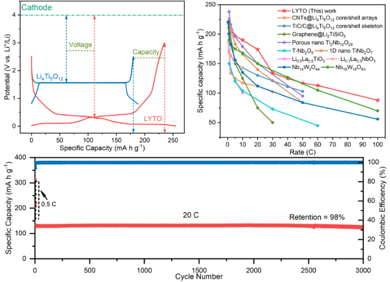 作為鋰電負(fù)極,鈦酸釔鋰的平均工作電壓為0.3Vvs.Li+/Li,可逆比容量達(dá)到230mAhg-1,更低的工作電壓和更高的比容量使得鈦酸釔鋰電池能量密度數(shù)倍于鈦酸鋰電池。此外,鈦酸釔鋰具有出色的倍率性能和循環(huán)穩(wěn)定性,其倍率比容量超過(guò)了大多數(shù)已報(bào)道的鈦基負(fù)極材料,在20C(1C=200mAg-1)下循環(huán)3000次后容量保持率高達(dá)98%。