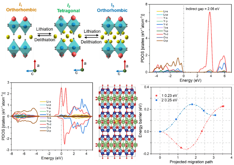 利用一系列的表征和第一性原理計(jì)算,本工作還詳細(xì)探究了該類材料的儲(chǔ)鋰機(jī)理(圖3)。鈦酸釔鋰在鋰離子嵌入/脫嵌過(guò)程中會(huì)發(fā)生可逆的三階段固溶轉(zhuǎn)變,鋰離子可沿鈦酸釔鋰中的二維通道快速遷移,這一過(guò)程伴隨著微小的體積變化。