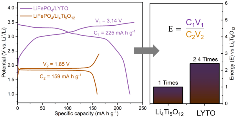 另外,在匹配磷酸鐵鋰(LiFePO4)正極后,鈦酸釔鋰全電池的能量密度為磷酸鐵鋰/鈦酸鋰全電池的2.4倍(圖4),進(jìn)一步表明鈦酸釔鋰作為低電壓、高倍率負(fù)極材料的潛在應(yīng)用價(jià)值。