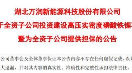 1月16日,萬潤新能發布公告,其全資子公司湖北宏邁高科新材料有限公司計劃投資建設“7萬噸/年高壓實密度磷酸鐵鋰項目”。該項目總投資額為10.79億元,資金來源于公司自籌,建設周期約12個月。公司將為該項目提供7億元擔保。萬潤新能表示,隨著新能源市場對電池能量密度、循環性能及安全性的要求不斷提高,磷酸...