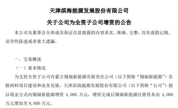 12月25日晚間,濱海能源發布公告稱,為支持全資子公司內蒙古翔福新能源有限責任公司(以下簡稱“翔福新能源”)負極材料項目建設和業務發展,公司擬以現金方式向翔福新能源增資4,000萬元,增資完成后翔福新能源注冊資本由4,000萬元增加至8,000萬元。注:圖片非商業用途,存在侵權告知刪除!...