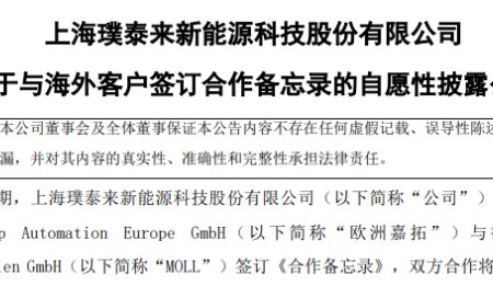 4月9日,璞泰來發(fā)布公告稱,近期,控股子公司Katop Automation Europe GmbH(以下簡(jiǎn)稱“歐洲嘉拓”)與德國MOLL Batterien GmbH(以下簡(jiǎn)稱“MOLL”)簽訂《合作備忘錄》,雙方將圍繞MOLL德國鈉離子電池工廠項(xiàng)目全生命周期展開為期24個(gè)月的合作。據(jù)了解,MO...