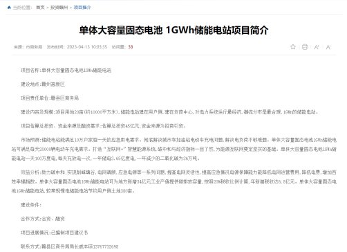 4月13日,贛江商務局發布項目簡介,擬投建單體大容量固態電池 1GWh儲能電站。據悉,該儲能電站建在用戶側負荷中心,用地20畝(約10000平方米),項目估算總投資45億元,資金來源為招商引資。該項目可以實現削峰填谷、電網調頻、應急電源等功能,提高電網靈活性、提高應急情況電源保障能力,能降低電網運營...
