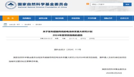 2月26日,國家自然科學(xué)基金委員會(huì)發(fā)布《關(guān)于發(fā)布超越傳統(tǒng)的電池體系重大研究計(jì)劃2024年度項(xiàng)目指南的通告》。通告指出超越傳統(tǒng)的電池體系重大研究計(jì)劃面向“雙碳”戰(zhàn)略和國家安全的重大需求,針對(duì)儲(chǔ)能電池與動(dòng)力電池在能量密度、功率密度、安全性、環(huán)境適應(yīng)性、資源與成本等方面面臨的關(guān)鍵科學(xué)問題和技術(shù)瓶頸,發(fā)展超...